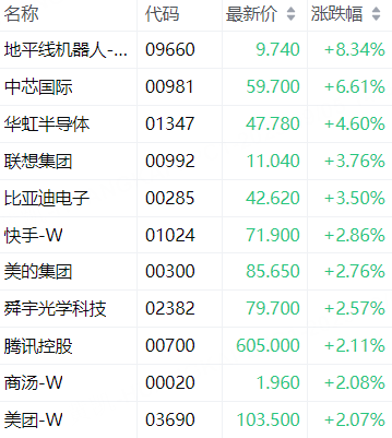 9月5日,港股午后持续走高,恒生科技指数涨幅扩大至2%,恒生指数涨1.4%。科指成分股中,地平线机器人-W涨超8%,中芯国际涨近7%,华虹半导体涨近5%。有色金属股午后涨幅扩大,天齐锂业涨超12%,赣锋锂业涨超11%。