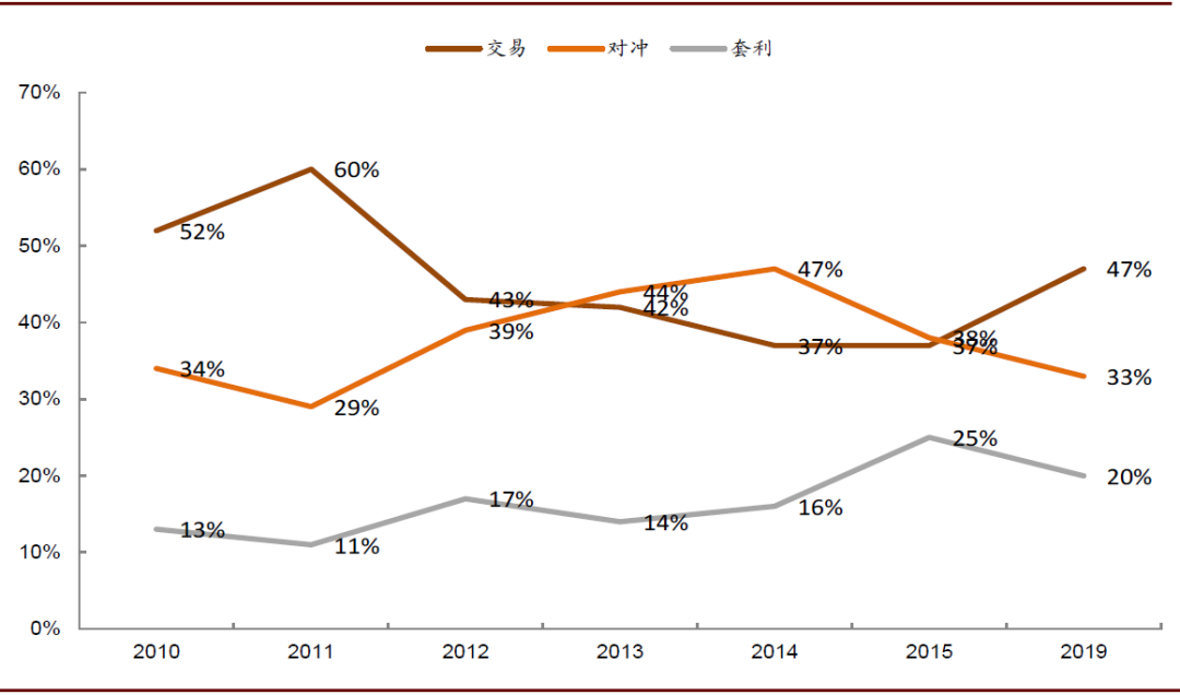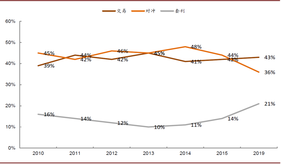 满足投资者风险管理需求,使投资策略更多元化:根据港交所2019年的调查报告,从投资者结构看,海外和本地投资者均在香港衍生品市场扮演了重要角色,其中做市商自营交易、本地机构投资者和海外机构投资者的市场交易占比分达到41%、14%和26%。从投资策略看,对冲和纯交易是投资者使用期货和期权等衍生品的主要目的。港交所上市新指数衍生品无疑为投资者提供了更全面的对冲和交易工具,使投资策略更加多元化,一定程度上也将促进现货的交投活跃度。
