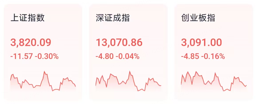 今日A股主要指数缩量震荡,热点概念表现较为散乱。截至收盘,沪指跌0.30%报3820.09点,深成指跌0.04%报13070.86点,创业板指下跌0.16%报3091.00点。