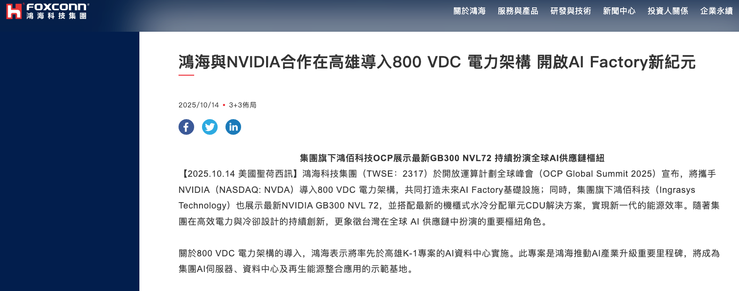 富士康在官网上宣布,公司正在与英伟达合作,推动800伏直流电源架构落地人工智能(AI)数据中心。这一新架构将首先在高雄K-1人工智能数据中心项目中实施,该项目作为展示平台,展现公司在AI服务器、数据中心及可再生能源整合方面的能力。