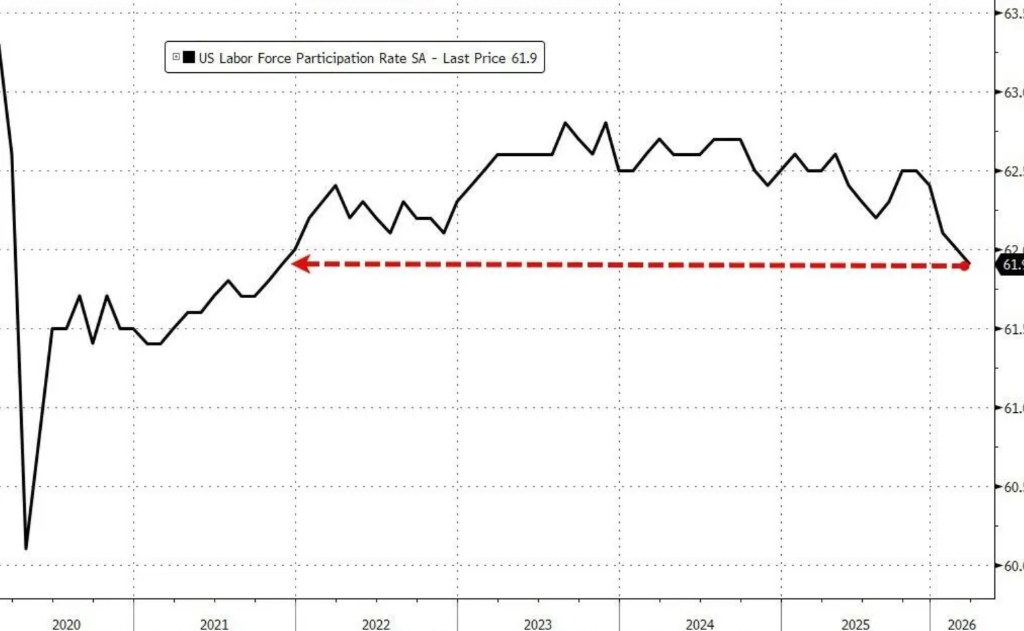 失业率的下降,背后存在结构性因素值得关注。家庭调查数据显示,实际就业人数有所下降,但民间劳动力人口同期大幅减少约40万人,从1.7048亿降至1.7009亿,共同推动失业率数字下行。与此同时,劳动参与率跌至五年低点。