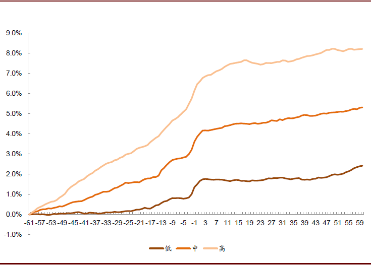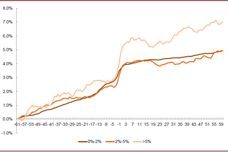 图表:不同公募持仓比例的个股发布业绩好消息累计超额收益