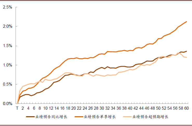 公告日前后均是较优布局时点:发布业绩好消息的公司,在公告日前60个交易日就呈现稳健正超额收益,且在公告前10个交易日加速上涨。而公告日当天股价则基本呈现跳空高开,次日至后60个交易日依然有正超额收益,但上涨幅度明显弱于公告日前。整体来看,业绩有利好的公司股价上涨持续性较强,公告日前后均是较优布局时点。