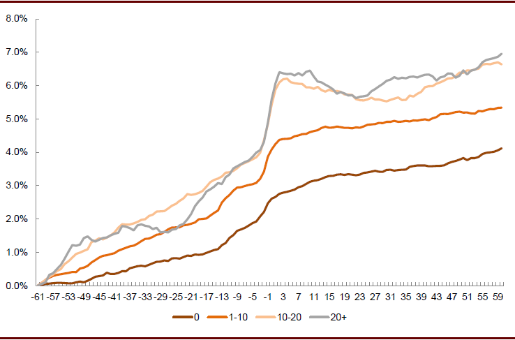 图表: 不同分析师覆盖数量的个股发布业绩好消息累计超额收益