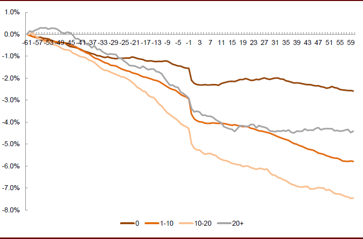 图表: 不同分析师覆盖数量的个股发布业绩坏消息累计超额收益