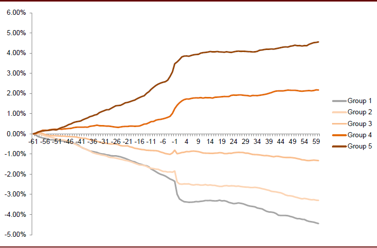 图表: A股市场的PEAD现象亦较为显著:基于正式报告单季同比增速从低到高将个股分为五组(Group 1即为坏消息公司,Group 5即为好消息公司)