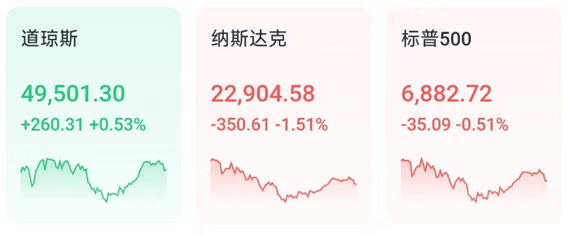 2月4日周三,美股三大指数涨跌不一。截至收盘,道琼斯涨0.53%,报49501.30点;标普500跌0.51%,报6882.72点;纳斯达克跌1.51%,报22904.58点。