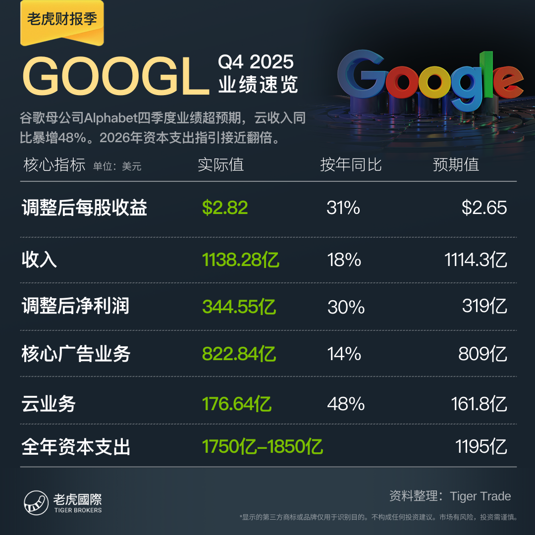 谷歌All in AI:Q4云收入猛增48%,今年支出指引接近翻倍大超预期,盘后巨震。Q4 Alphabet总营收同比增18%、再创新高,研发费用因AI投入激增42%,计入21亿美元一次性Waymo薪酬费用后,营业利润率仍超30%;谷歌云收入较分析师预期高逾9%;搜索收入超预期增17%;Waymo等其他押注收入降7.5%、远逊预期;2026年支出指引中位数1800亿美元,较预期高逾50%。CEO称支出将帮助满足客户需求并把握增长机会。
