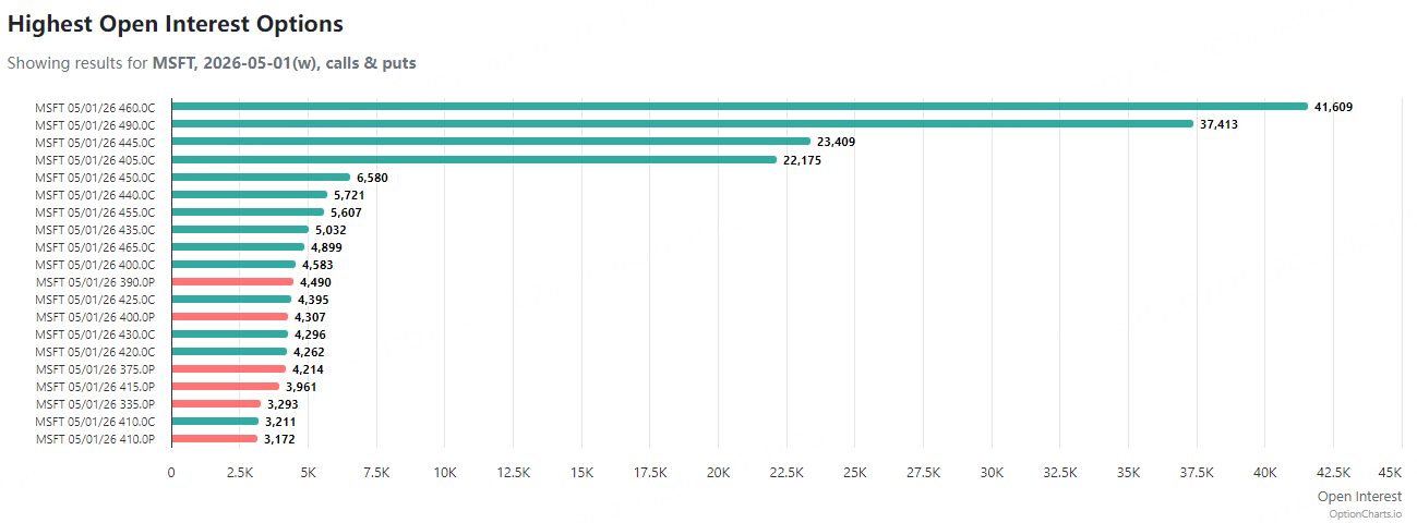 未平仓合约(OI)集中度:在5月1日到期的期权中,看涨期权的未平仓量显著集中。行权价460美元(OI: 41,609)、445美元(OI: 23,409)和405美元(OI: 22,175)的看涨期权构成了市场博弈的焦点区域,显示大量头寸围绕这些关键价位展开。