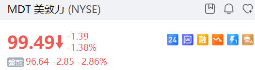 美敦力股价在盘前交易中起初上涨,随后走势逆转,下跌2.86%至96.64美元。同期,追踪基准标普500指数的期货微跌0.3%。