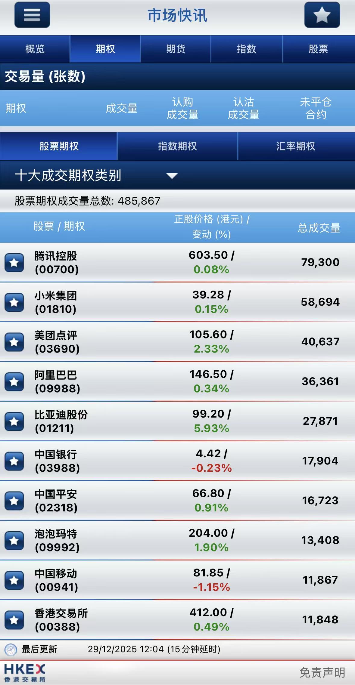 截止午间收盘,港股期权半日成交逾48.58万张,其中,腾讯控股成交量居首,期权成交近8万张;小米集团-W名列次席,期权成交5.87万张;美团-W位居第三,期权成交逾4万张。