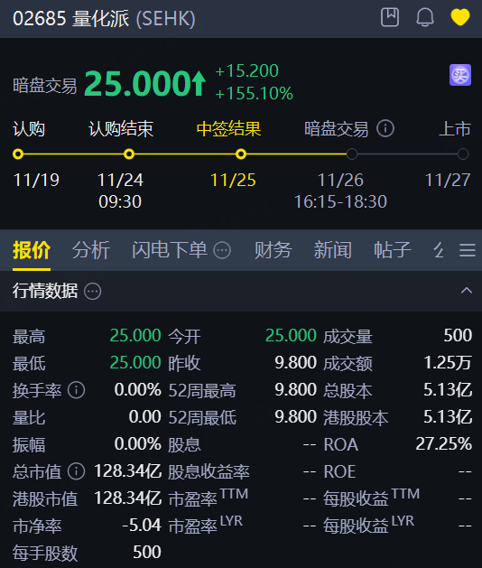 11月26日,量化派暗盘飙涨逾155%,总市值近130亿港元;不计手续费,中签一手赚7600港元;公司每股定价9.8港元,每手500股,将于11月27日(周四)正式挂牌交易。