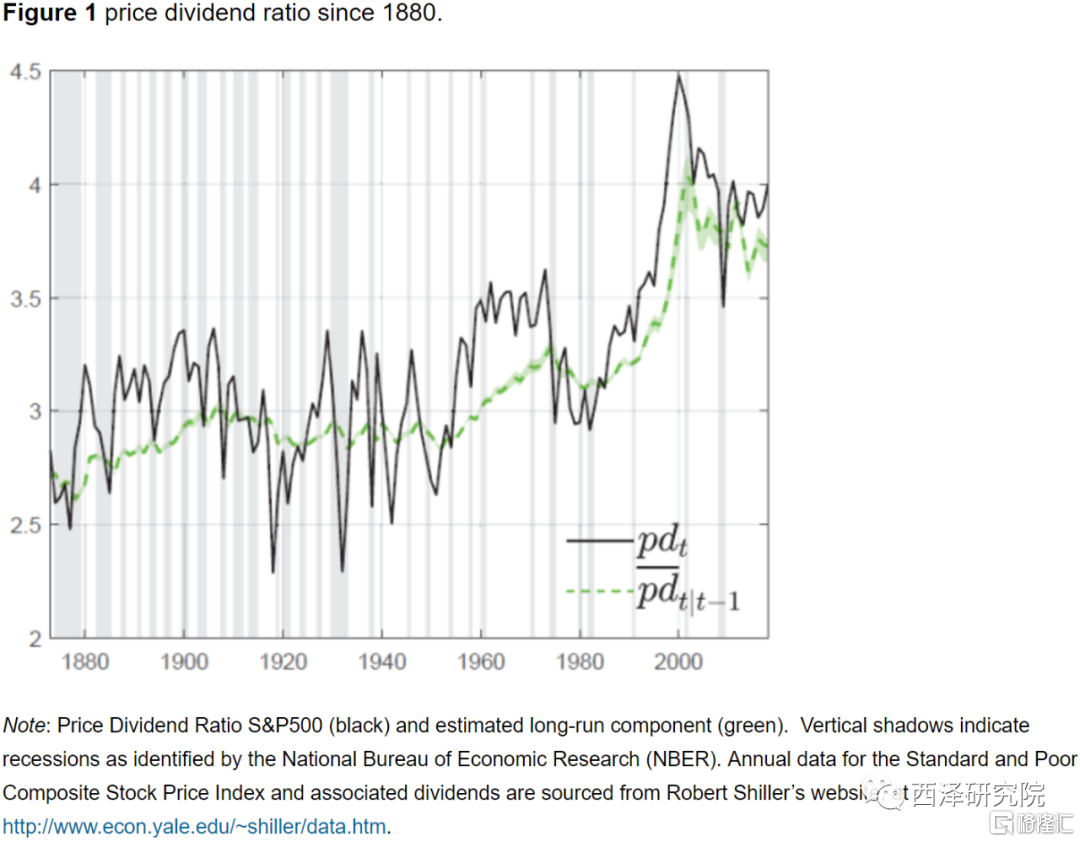 Campbell和Shiller(1988)的分解式可以为过去70年推动股票估值的因素研究提供一些启示,无论是高预期红利增长还是低预期回报(译者注:Campbell和Shiller提出了基于对红利会计恒等式进行线性近似的框架(红利波动和价格波动差异只可能来自价格红利比(P/D)的变化),利用线性近似后的方程将P/D波动进行分解,以寻找产生两者差异的影响因素)。这项操作并不简单,原因在于它需要一个能同时运行两个项目的计量模型:首先,从短暂的波动中分离出一个趋势成分,以从暂时的冲击中过滤掉股利增长和股票收益的预期成分;其次,将Campbell和Shiller(1988)提出的价格红利比率的精确分解应用于这两种趋势。