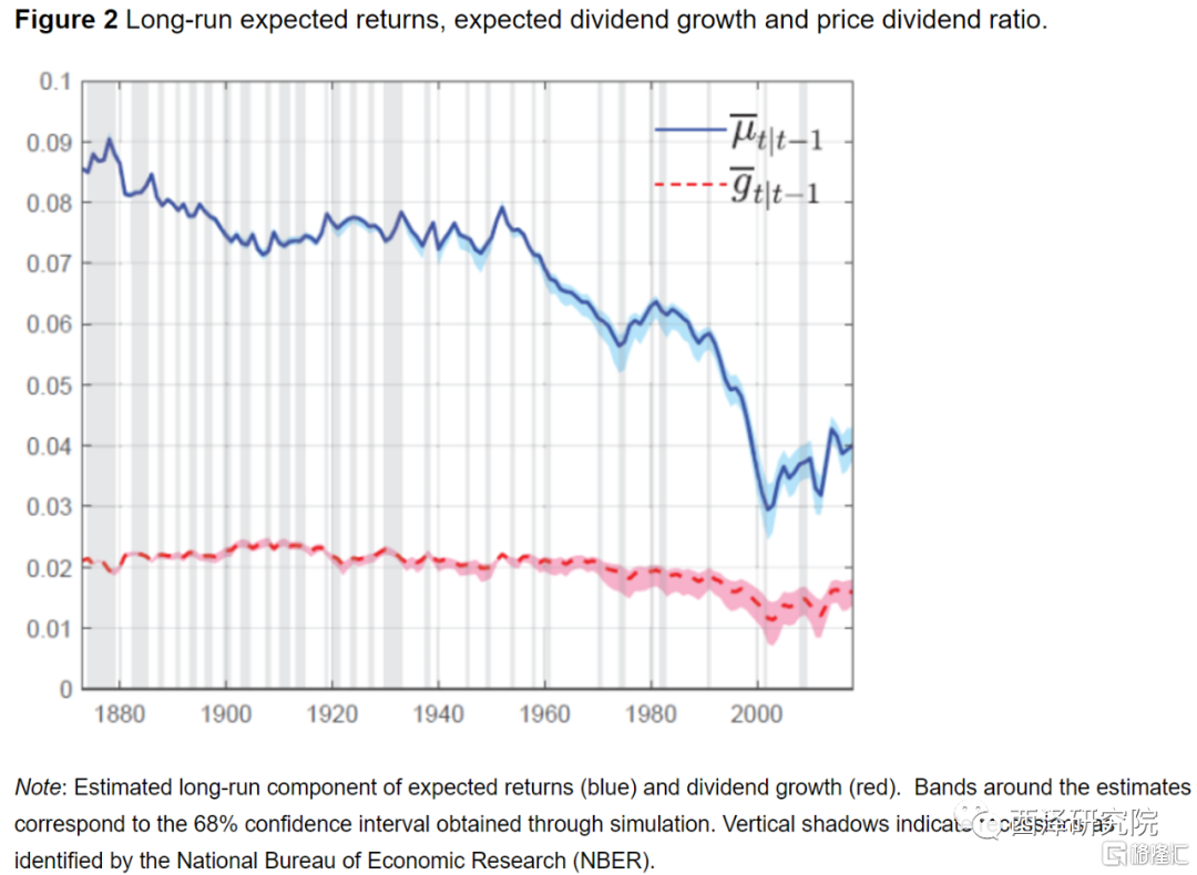 我们在近期的一篇论文中发展了一种新的计量经济学方法,用于从长期角度分析股票估值、预期股利增长以及预期收益之间的时变关系。我们观察到,股票估值的长期上升主要是由于预期收益率的走低。过去150年中,预期收益率从约8%下降到4%(图表2,蓝线)。分红的长期增长也有所放缓,但降幅相对温和(从2%下降到1.5%,图表2红线),且无法从数量上解释估值的上升。这一结果相当直观。在一个长期停滞、即低增长和低利率的世界中,人们期望能够抬升股价的,实际上是低折现率,而并非分红增长。我们的研究结果对于解释当前的市场状况具有重要意义。
