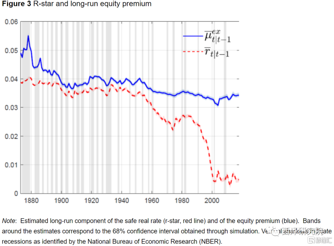为什么折现率会下降这么多?此处打个比方,股票的估值就好比是“债券+风险”。因此,要么是债券的长期预期回报率(衡量“中性利率”(r-star)的指标)下降,要么是风险偏好上升。在本文中,我们进一步探讨了这一问题,并使用我们的方法将预期股票收益分解为安全成分(实际利率)和长期股权溢价。我们发现,前者基本上是股票估值上升的主因。一方面,r-star已经从20世纪50年代的3%左右下降到目前的0.5%左右(图表3,蓝线);另一方面,长期股权溢价基本保持稳定(图表3,红线)。