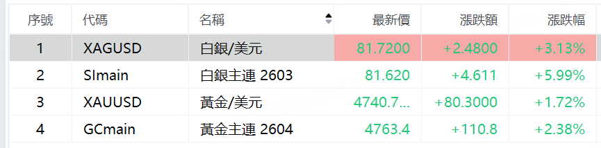 现货金银周二盘初走强,现货黄金涨至4740美元/盎司,日内涨1.7%;现货白银涨超3%,报81.72美元/盎司。