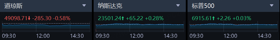 上周五,三大指数涨跌不一,纳指小幅上涨,标普500指数微涨,道指跌近0.6%。截至收盘,道琼斯指数跌0.58%,报49,098.71点;标普500指数涨0.03%,报6,915.61点;纳斯达克指数涨0.28%,报23,501.24点。