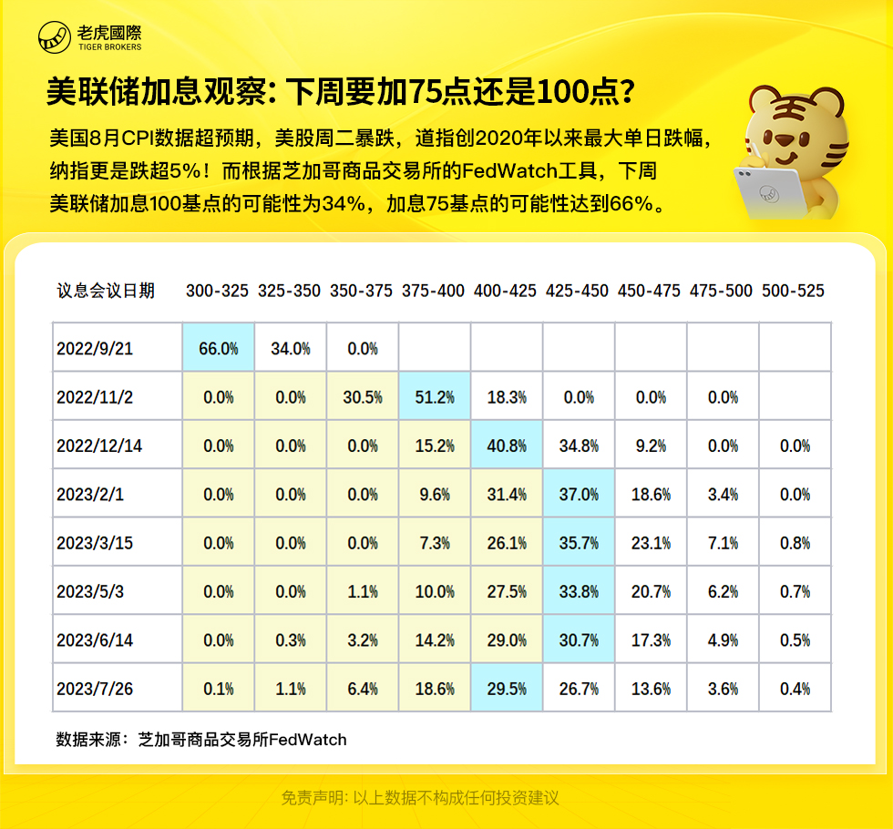 显然,对美国“通胀见顶”的预期暂时落空,美股周二暴跌,道指创2020年以来最大单日跌幅,纳指更是跌超5%!而根据芝加哥商品交易所的FedWatch工具,下周美联储加息100基点的可能性为34%,加息75基点的可能性达到66%。