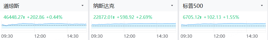 周一(11月24日),美股三大指数集体反弹。截至收盘,纳斯达克综合指数涨2.69%,报22872.01点;道琼斯指数涨0.44%,报46448.27点;标普500指数涨1.55%,报6705.12点。