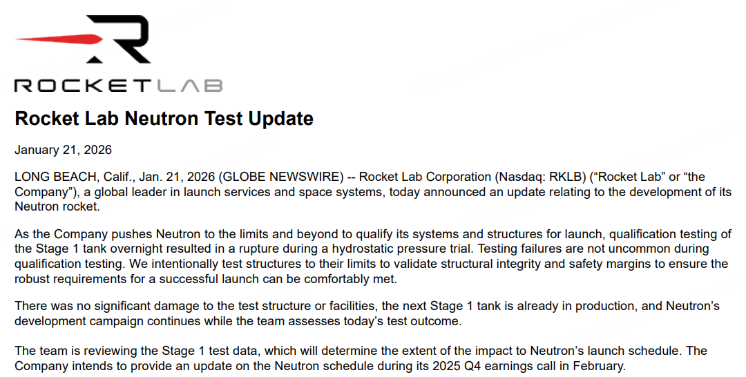 1月22日, Rocket Lab盘后一度跌超8%!此前公司发布公告,宣布其Neutron火箭系统结构极限测试中出现故障。