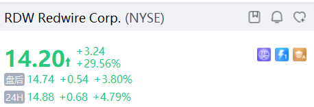 Redwire涨近5%,公司被选中参与美国导弹防御局1510亿美元的防御盾合同;