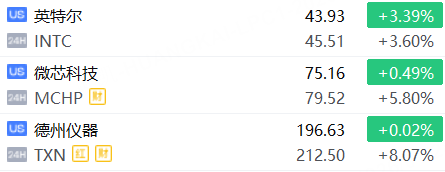 美股半导体概念股上涨,德州仪器涨超8%,微芯科技涨近6%,英特尔涨近4%。