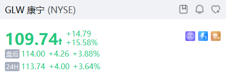 康宁续涨超3%,上一交易日大涨超15%。Meta已与公司签署价值高达60亿美元的长期光纤供货协议。