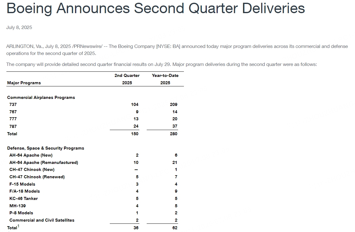 7月8日,波音公司6月份交付飞机60架,创2023年12月份以来新高;二季度累计交付超过150架,创2018年以来同期新高;公司一直设法让生产线趋于稳定,并提高产量。