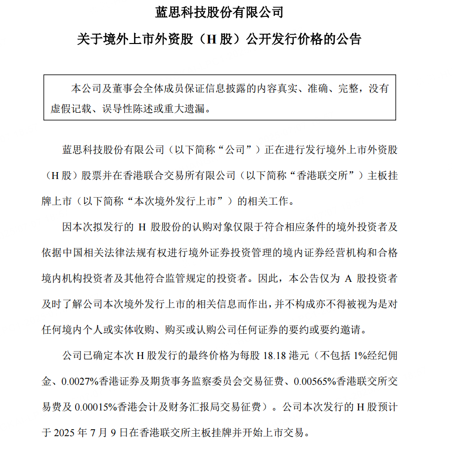 7月7日,蓝思科技公告称,公司已确定本次H股发行的最终价格为每股18.18港元。