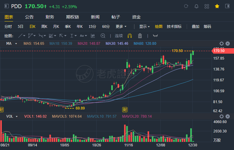 12月30日消息,拼多多低开后,快速走高,现涨超2%,盘中股价创新高。