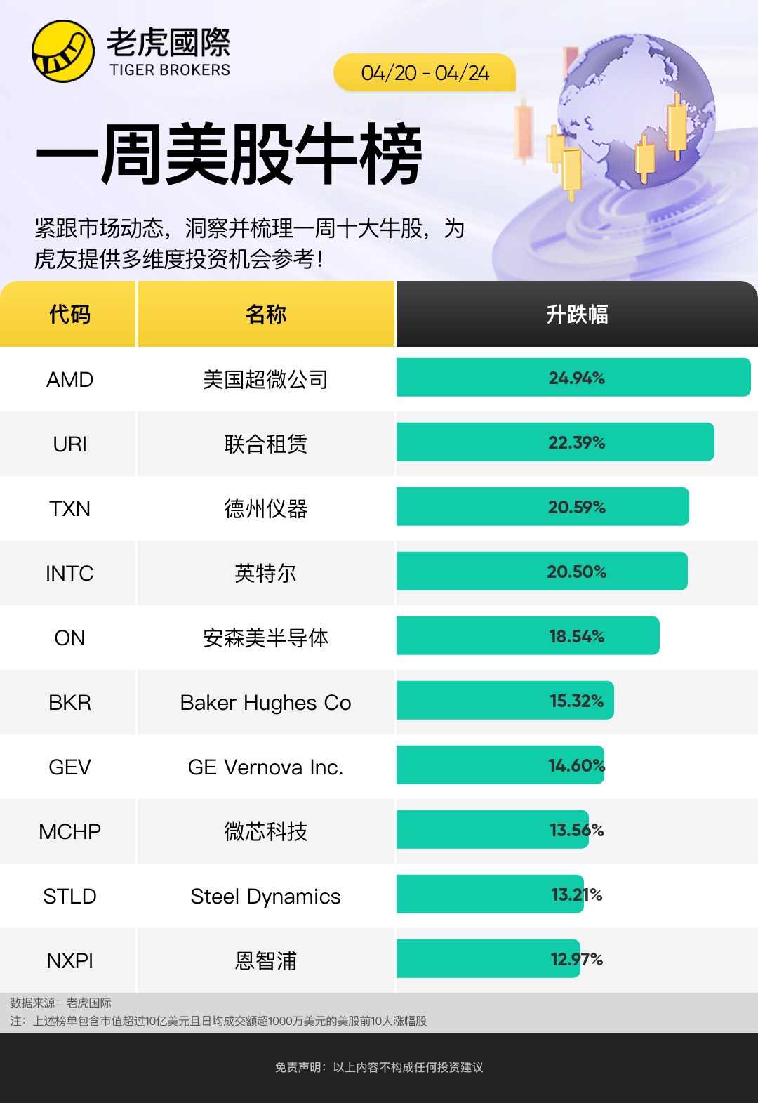 上周哪些股票表现优异?以下是截至4月24日当周标普500指数涨幅前十的股票: