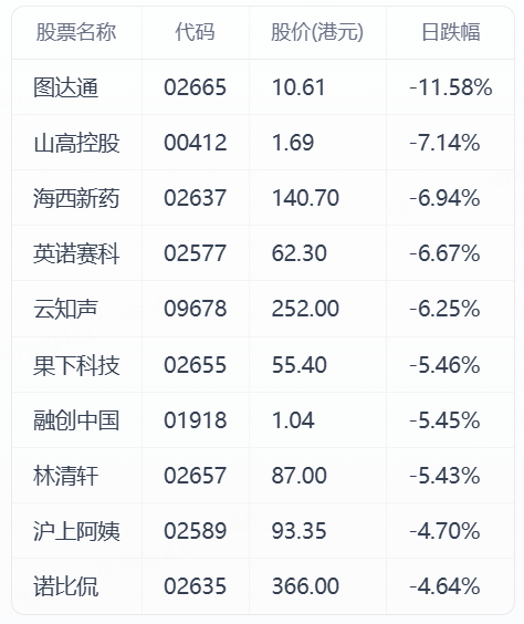 港股今日跌幅TOP10