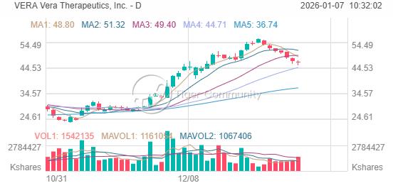 另一家受富国银行看好的公司是生物科技企业 Vera Therapeutics, Inc. ,该股过去一年上涨11%。去年10月,美国银行在首次覆盖报告中给予Vera"买入"评级,目标价48美元。
