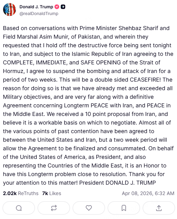 美国总统特朗普表示:“基于与巴基斯坦总理谢里夫和巴基斯坦陆军元帅阿西姆·穆尼尔的会谈,他们请求我今晚不要向伊朗部署破坏性力量,并且以伊朗同意完全、立即且安全地开放霍尔木兹海峡为前提条件,我同意暂停对伊朗的轰炸和攻击,为期两周。这将是一项双向停火!这样做的原因是,我们已经达到甚至超越了所有军事目标,并且在与伊朗达成长期和平协议以及中东和平协议方面取得了重大进展。我们收到了伊朗提出的十点建议,并认为这是一个可行的谈判基础。美国和伊朗之间几乎所有过去的争议点都已达成一致,两周的时间将使协议得以最终敲定和生效。作为美国总统以及代表中东各国,我非常荣幸能在这个长期问题的解决上取得进展。