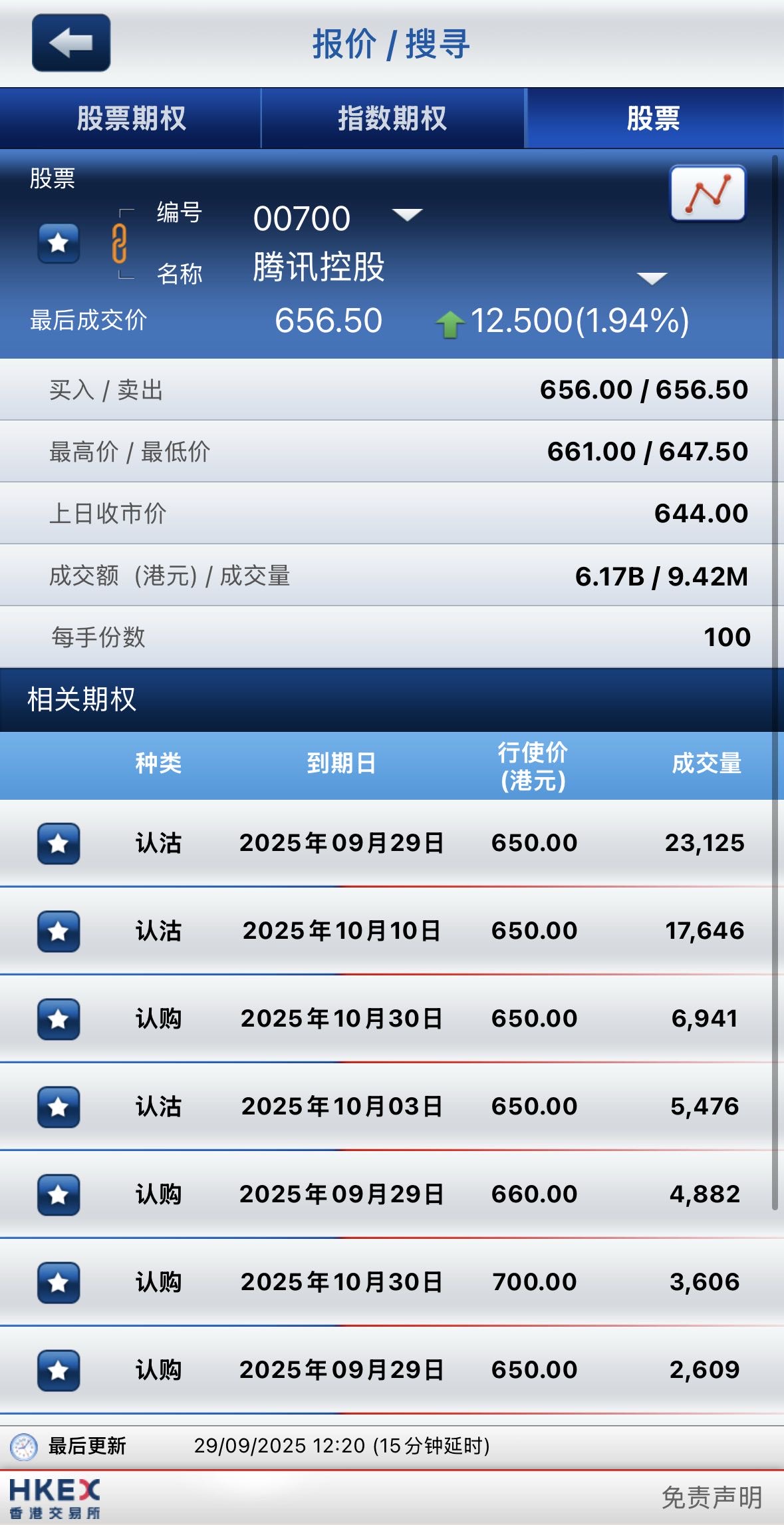 腾讯股价收涨近2%,半日期权成交逾11万张,认沽期权成交活跃,其中,其中于9月29日到期650港元行使价的认沽期权成交居前,成交超2.3万张;于10月10日到期650港元行使价的认沽期权成交位居第二,成交超1.7万张。