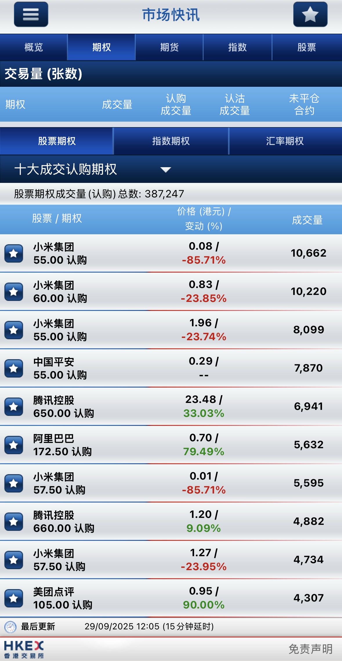 截止午间收盘,港股期权半日成交超67万张,较前一交易日大幅上涨;其中,腾讯控股成交量居首,期权成交超11.6万张;小米集团-W名列次席,期权成交超10万张;阿里巴巴-W位居第三,期权成交超6.7万张。