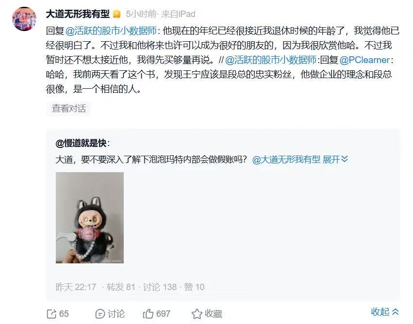 4月3日,段永平公开发文称:“他(王宁)现在的年纪已经很接近我退休时候的年龄了,我觉得他已经很明白了。不过我和他将来也许可以成为很好的朋友的,因为我很欣赏他哈。不过我暂时还不想太接近他,我得先买够量再说。”