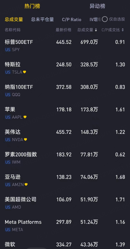 当日美股期权市场总成交量38,109,331张合约。其中,看涨期权占比53%,看跌期权占比47%。