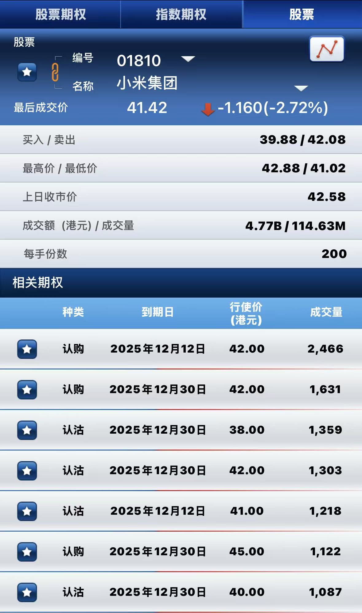 小米集团-W跌超2%,期权方面:半日成交超3.3万张合约,其中于12月12日到期行权价42港元的认购期权成交量居前,成交近2500张合约。 $MIU.HK 20251212 42.00 CALL$