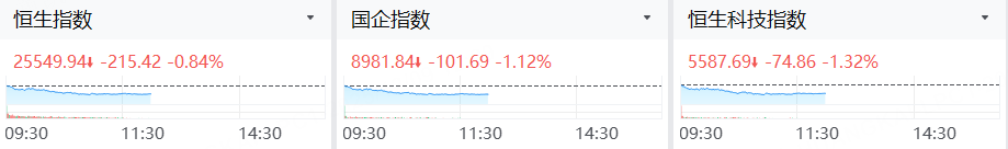 12月9日,港股三大指数齐跌,截止午间收盘,恒指跌0.84%,科指跌1.32%,国指跌1.12%。