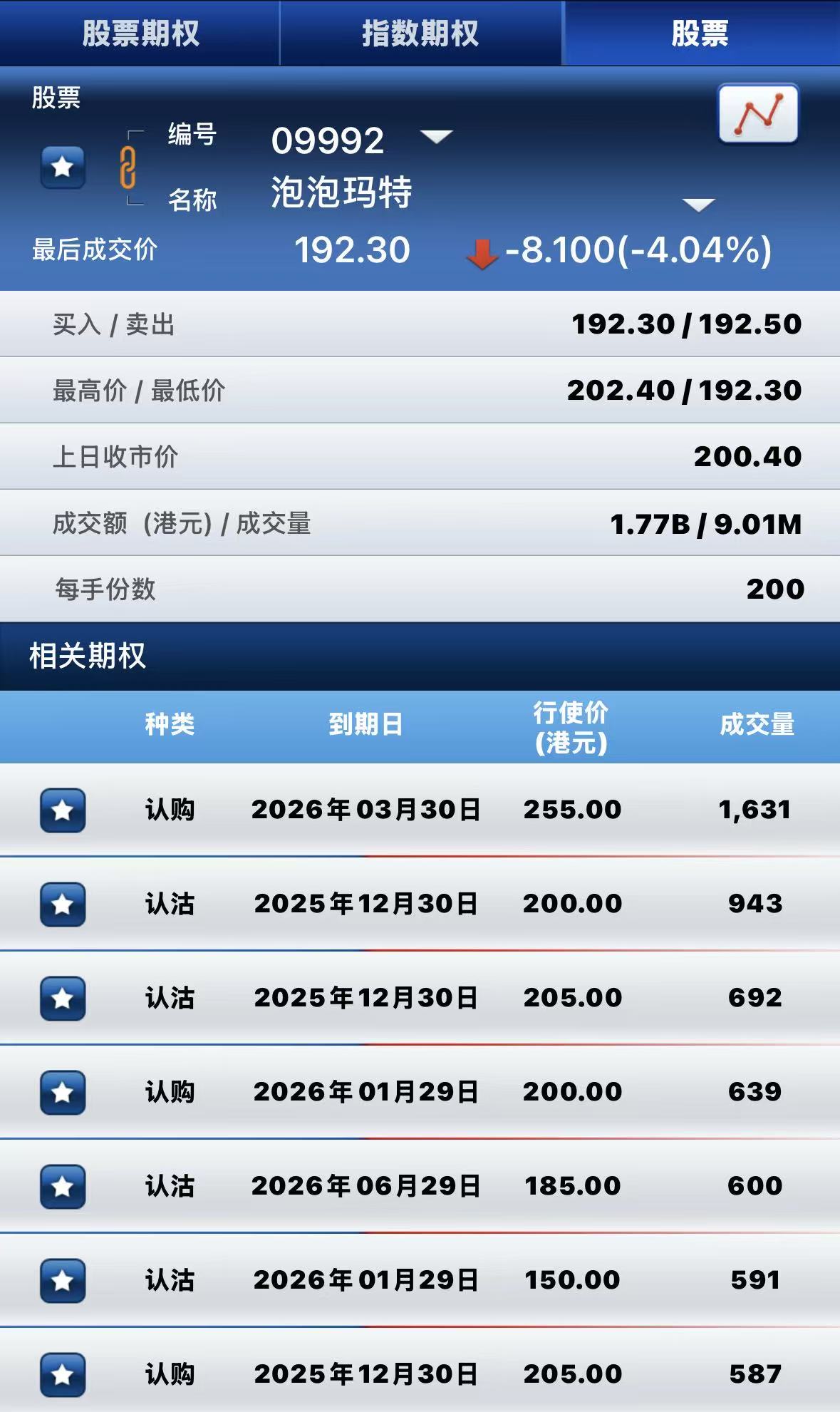 泡泡玛特跌超4%,期权方面:半日成交超1.8万张合约,其中于2026年3月30日到期行权价255港元的认购期权成交量居前,成交超1600张合约。 $POP.HK 20260330 255.00 CALL$