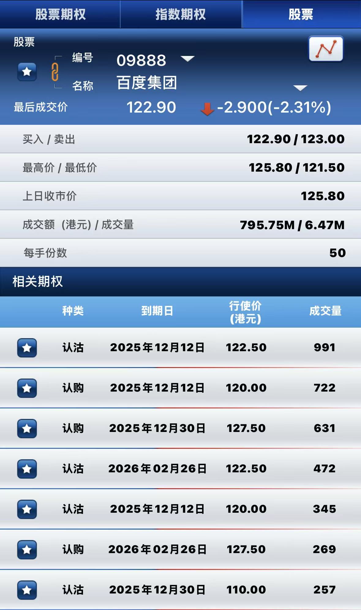 百度集团-SW跌超2%,期权方面:半日成交超1万张合约,其中于12月12日到期行权价122.50港元的认沽期权成交量居前,成交近1000张合约。 $BIU.HK 20251212 122.50 PUT$