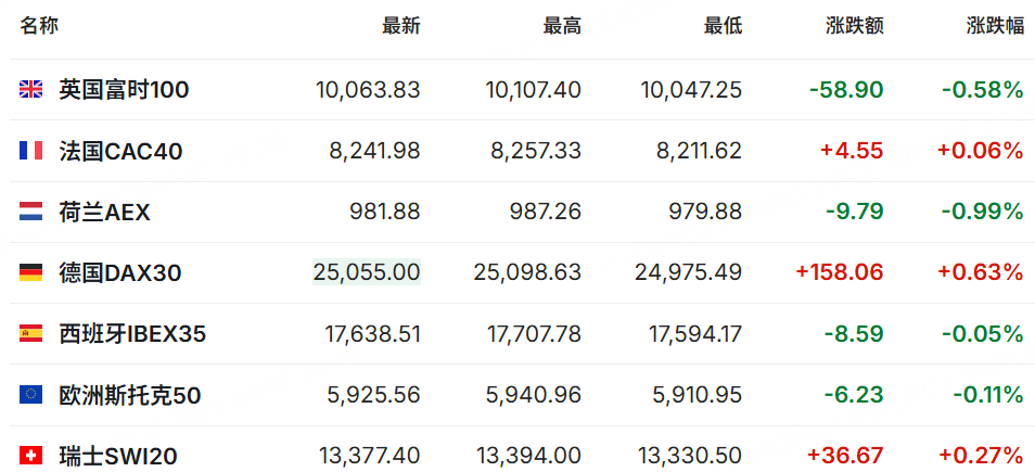 欧洲主要股指涨跌不一,截至发稿,英国富时100跌0.58%,法国CAC40涨0.06%,德国DAX30指数涨0.63%。