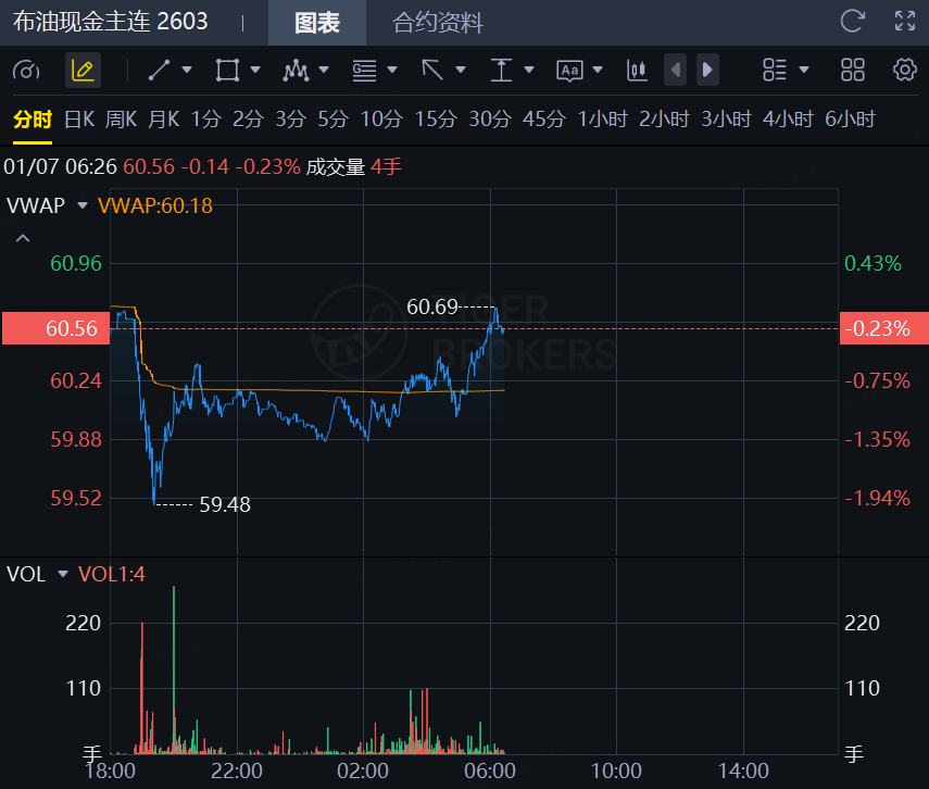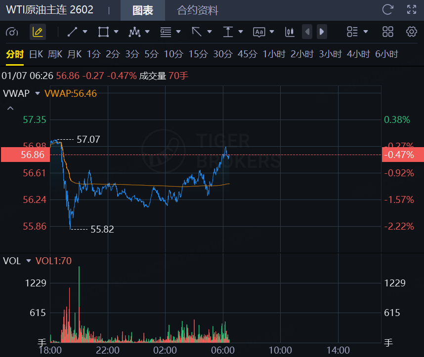 原油期货日内走低,截止发稿,WTI原油跌0.47%,报56.86美元/桶;布伦特原油跌0.23%,报60.56美元/桶。