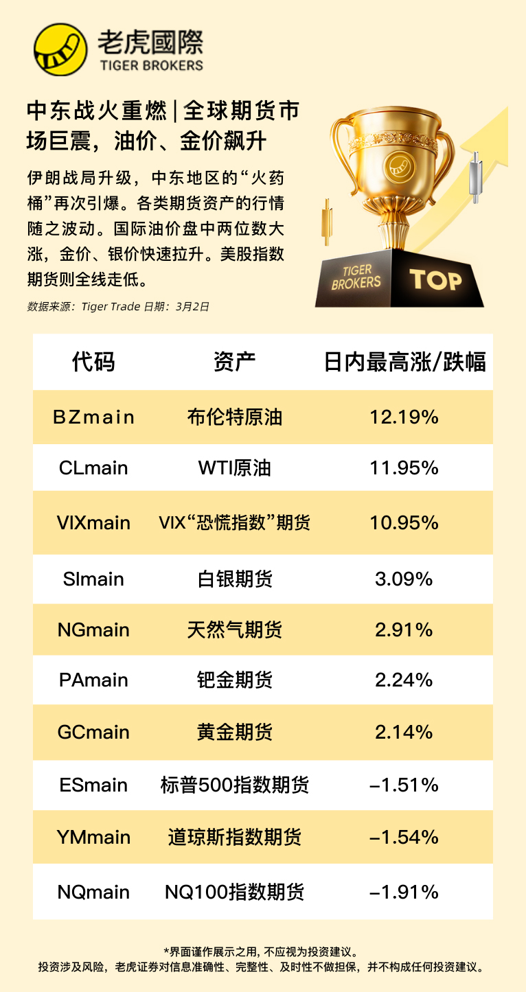 上周末,美、以联合对伊朗展开攻击,战局陡然升级,中东地区的“火药桶”再次引爆。周一,各类期货资产的行情随之大幅波动,国际油价盘中两位数大涨,金价、银价快速拉升。指数方面,VIX“恐慌指数”走高,美股三大期指则全线走低。