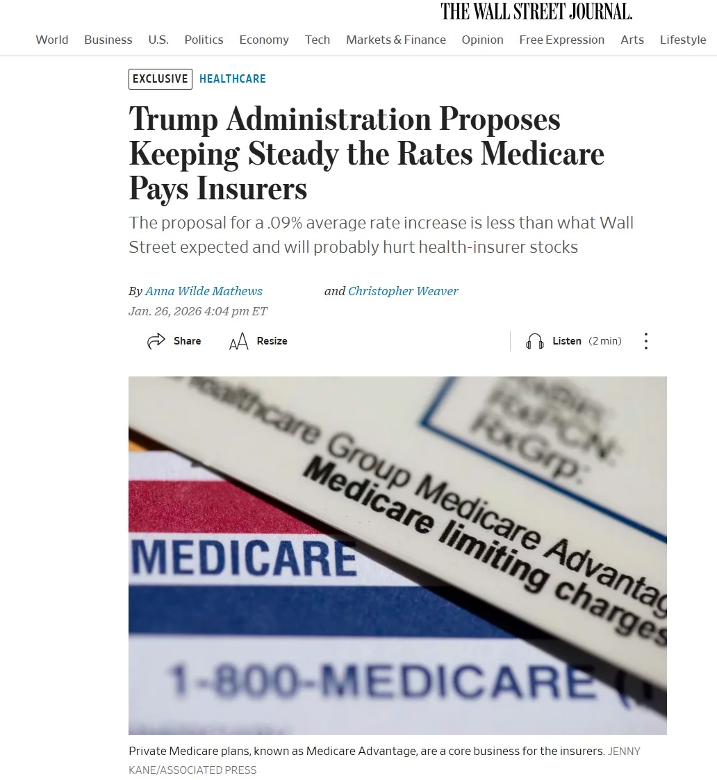 美东时间1月26日美股盘后时段,华尔街日报报道称,特朗普政府提议明年联邦医疗保险的费率大致保持不变,这一调整远低于华尔街的预期。