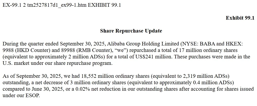 在截至2025年9月30日的季度内,阿里巴巴集团控股有限公司(Alibaba Group Holding Limited)共计回购1700万股普通股(相当于约200万股美国存托股份,ADSs),回购总额为2.41亿美元。上述回购是根据公司股票回购计划,在美股市场进行的。