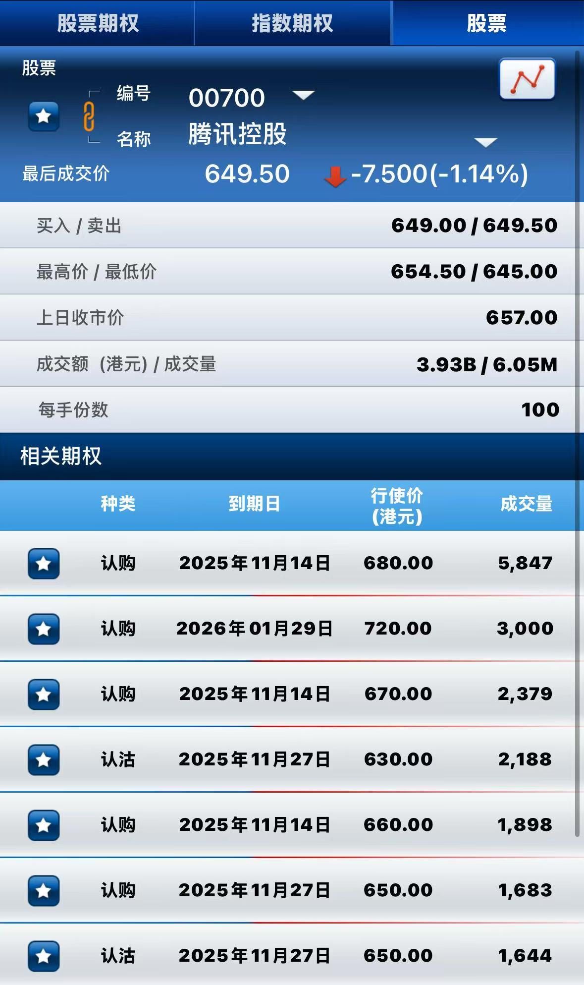 腾讯控股跌超1%,期权方面:半日成交近5万张合约,其中于2025年11月14日到期行权价680港元的认购期权成交量居前,成交超5800张合约。 $TCH.HK 20251114 680.00 CALL$