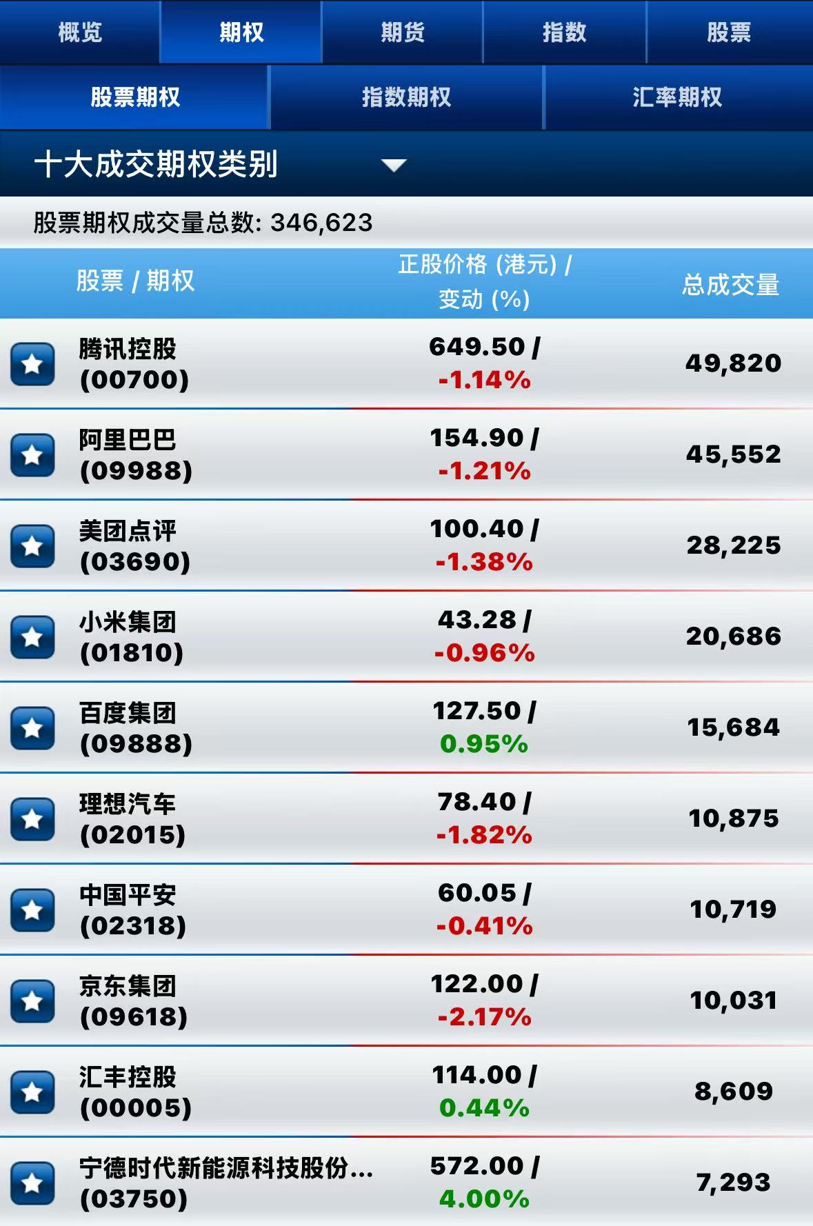 截止午间收盘,港股期权半日成交近34.7万张。其中,腾讯控股成交量居前,期权成交近5万张;阿里巴巴-W名列次席,期权成交超4.5万张;美团-W位居第三,期权成交超2.8万张。