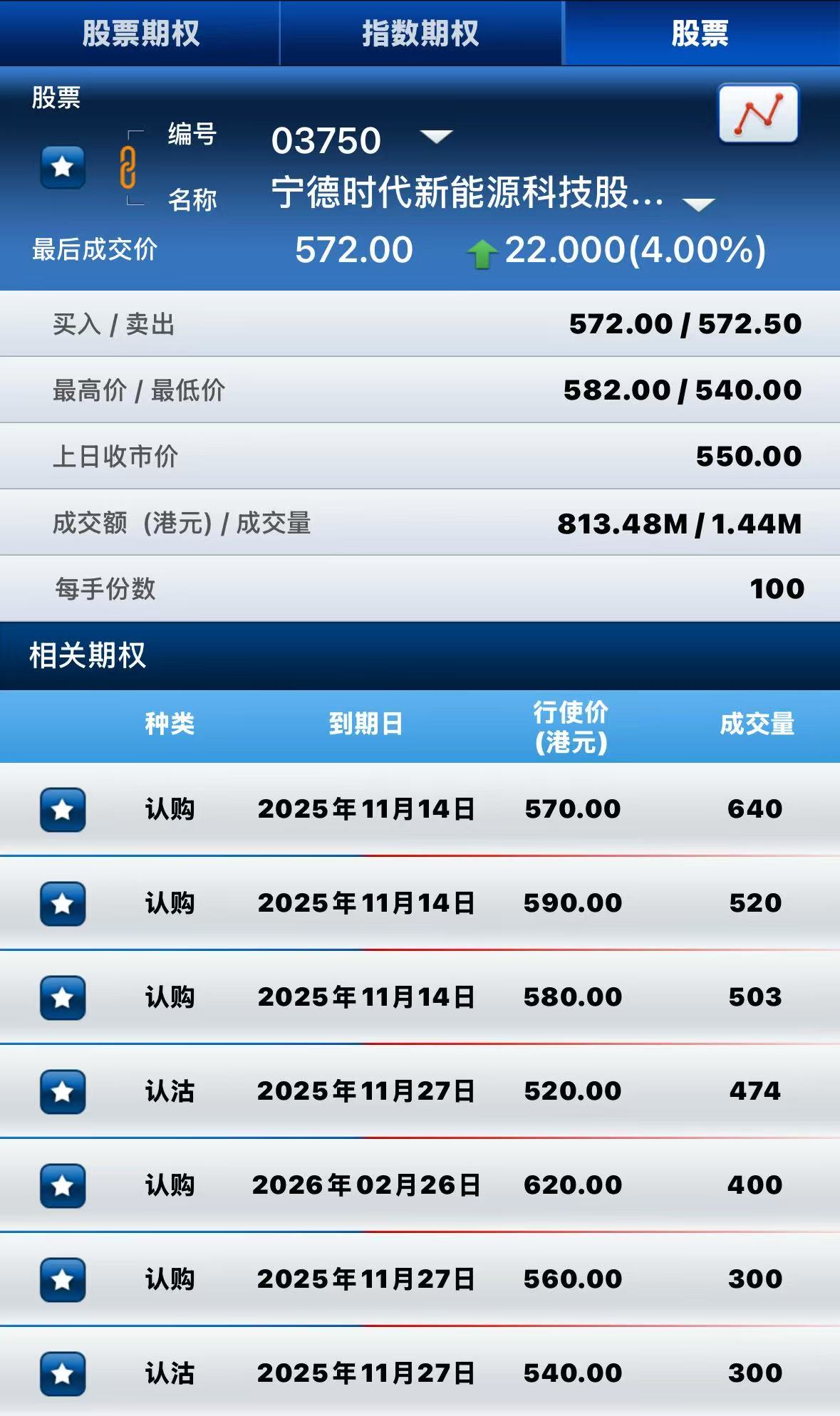 宁德时代上涨4%,期权方面:半日成交近7300张合约,其中于2025年11月14日到期行权价570港元的认购期权成交量居前,成交超600张合约。 $CAT.HK 20251114 570.00 CALL$